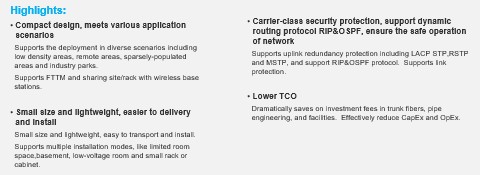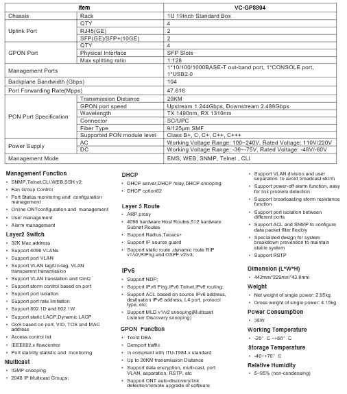 The VC-GP8804 is a pizza-box GPON OLT with 4 PON ports that meets flexible and fast FTTx access, suiting  the scenarios such as sparse/ remote/cost-sensitive area,smart industrial park, commercial building and  FTTM, etc.