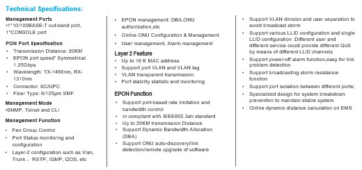 VC-EP6604-MINI provides the full management functions for onu according to CTC standard, Each of the 4 EPON OLT ports is fully compliant with IEEE 802.3ah standard and CTC 2.1specification for SerDes, PCS, FEC, MAC, MPCP State Machines, and OAM extension implementation. Both upstream and downstream are operational at 1.25 Gbps data rates.