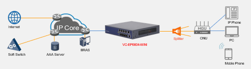 The VC-EP6604-MINI provide 4 GE interface for uplink, and 4 EPON ports for downstream. It can support 256 ONU under 1:64 splitter ratio. Each uplink port is connected to a EPON port directly, each PON port behaves as an independent, that EPON OLT port and there is no traffic switching between PON Ports and each PON port forwards packets to and receive packets from one dedicated uplink port.