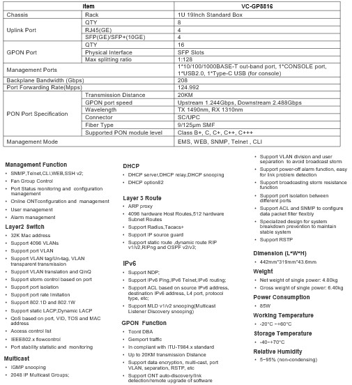 The VC-GP8816 is a pizza-box GPON OLT with 16 GPON ports that meets flexible and fast FTTx access, suiting  the scenarios such as sparse/ remote/cost-sensitive area,smart industrial park, commercial building and  FTTM, etc.